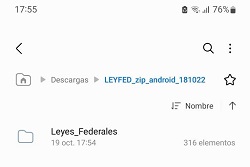 Utilizando la aplicación Mis Archivos de su dispositivo móvil, o la aplicación RAR para Android, descomprima el archivo descargado LEYFED_zip_android_091025.zip, que encontrará en la ubicación Descargas de su dispositivo.