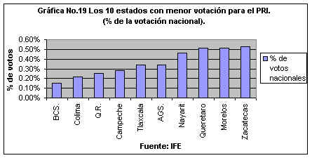 El PRD únicamente ganó el estado de Michoacán con 544 009 votos. La información proporcionada por las gráficas 6 y 7 es de particular relevancia sobre todo si lo comparamos con la conformación del padrón electoral para la elección federal del año 2000. Así, los 10 estados con mayor numero de votantes potenciales del padrón electoral federal fueron los siguientes: